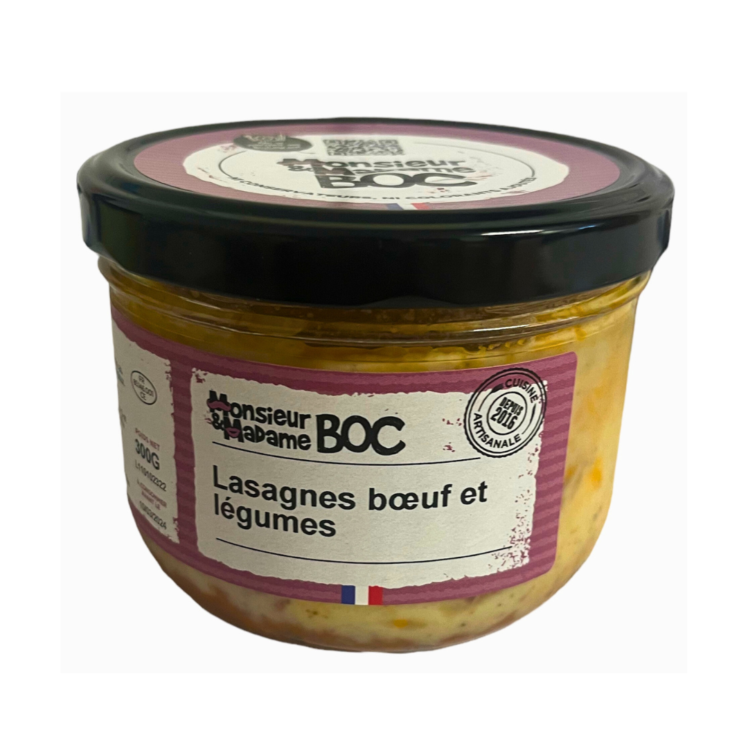 Liste des ingrédients : Egrené de bœuf origine France 24,5%, coulis de tomate 12,3% (tomate, huile de tournesol, oignon, sucre, sel, basilic), pâtes alimentaires 5,8% (semoule de blé dur, œufs pasteurisés, eau, sel, huile d'olive), champignon 4,9%, oignon 4,9%, carotte 4,9%, potiron 4,9%, lait demi-écrémé, emmental, beurre, farine de blé, huile de tournesol et d'huile d'olive vierge extra, sel, muscade, poivre